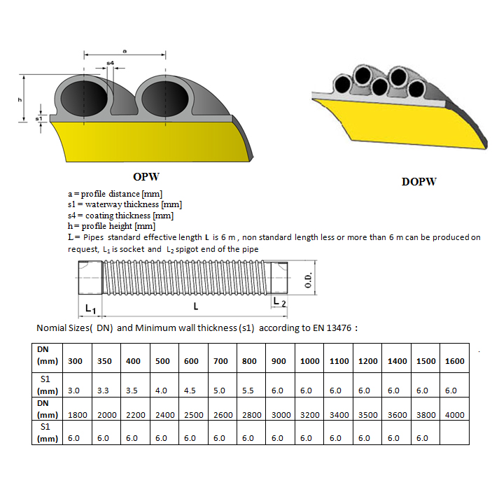 HDPE& PP pipes are manufactured in three different shapes according to the field of application and the purpose of use: 1- Series OPW : Single open profiled pipe (external profiled, internal smooth surface). 2- Series CPW : Close profiled pipe ( external and internal smooth surface). 3- Series DOPW : Double open profiled pipe (external profiled, internal smooth surface). 4- Series SW : solid pipe ( external and internal smooth surface). 5- Series VW : solid pipe ( external and internal smooth surface ).
