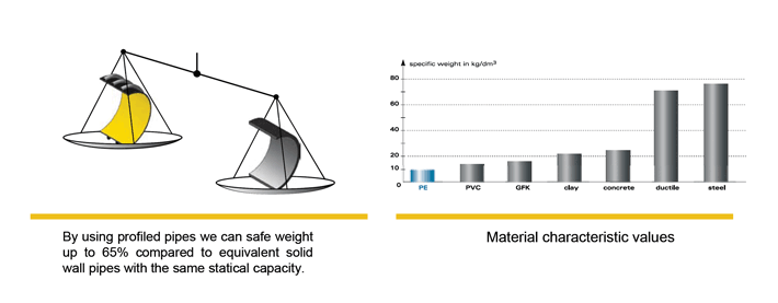 Comparison of design alternatives often employ the use of life cycle economic analyses. The life cycle cost of an alternative system or part of a system anticipates all the costs that are likely to occur over the service life. It includes the costs of the initial investment, inspection as well as scheduled maintenance, repair, rehabilitation and/ or replacement and disruption of services. Another important point is the design of the pipe wall. Earlier very large wall thickness for pipes had to be used in order to maintain loads, which influence the pipe. It resulted in heavy and very expensive pipes although wall thickness stipulated in the norms would be sufficient for the actual application of the pipe. In order to solve this problem the profile pipes have been developed. A profile is added to the minimum required basic wall. The profile is connected to this wall. This profile which is calculated by a special software produces a significant higher moment of inertia and thus the loads can be carried. For comparison, a solid wall pipe of the same material with respective moment of inertia would weigh three times more