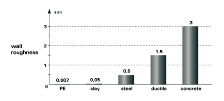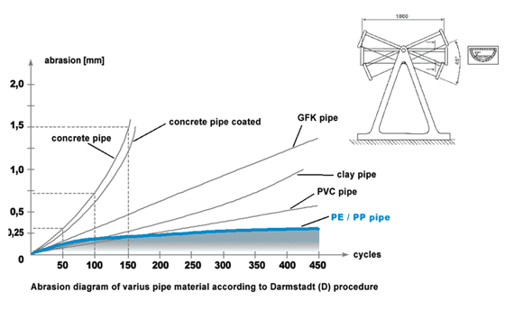 Polyethylene and polypropylene pipes are among the most abrasion proof pipes. The reference to the test is EN-295 and the results are shown in the diagram below and confirm the quality of HDPE pipes. The abrasion resistance are particularly indicated suitable