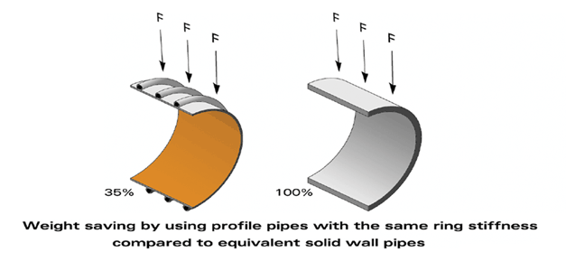 Profile and Stiffness By using a profiled pipe it is possible to use a light pipe for a high static load. The supportable static load is determined for every profile geometry by the factors elastic modulus ( N/mm ) of the respective material and the moment of inertia of the profile geometry ( mm / mm) referring to the pipe diameter. The result is allied ring stiffness. By using a profiled design pipe, the weight can be reduced up to 65% compared to a solid wall pipe with same ring stiffness. Al Bilad pipes offer the best security and durability.